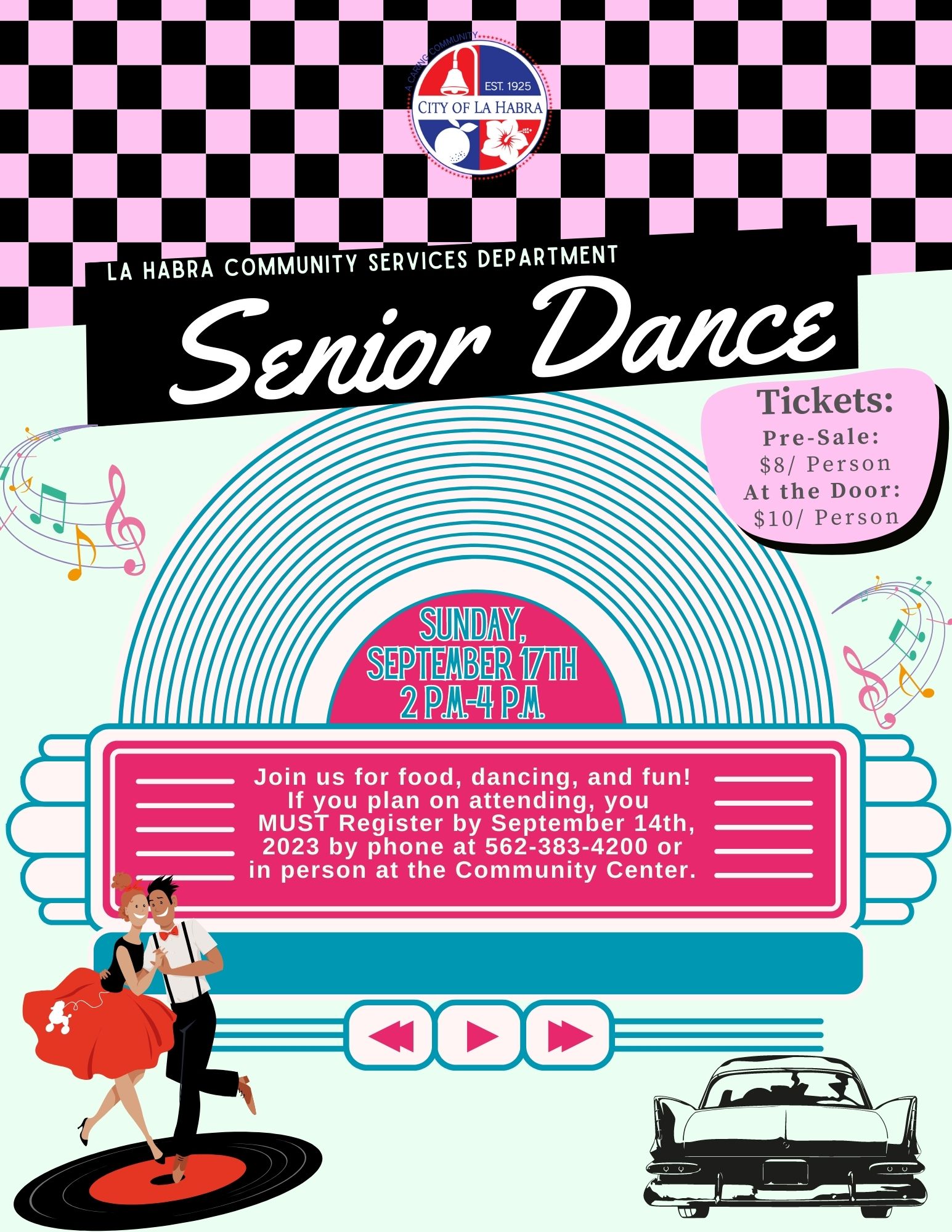 Join us for a Sunday afternoon of live music, dancing, and dinner, Sunday, September 17th, 2:00-4:00 p.m., at the La Habra Community Center, 101 W. La Habra Blvd. Dinner is served at 4:00 p.m.