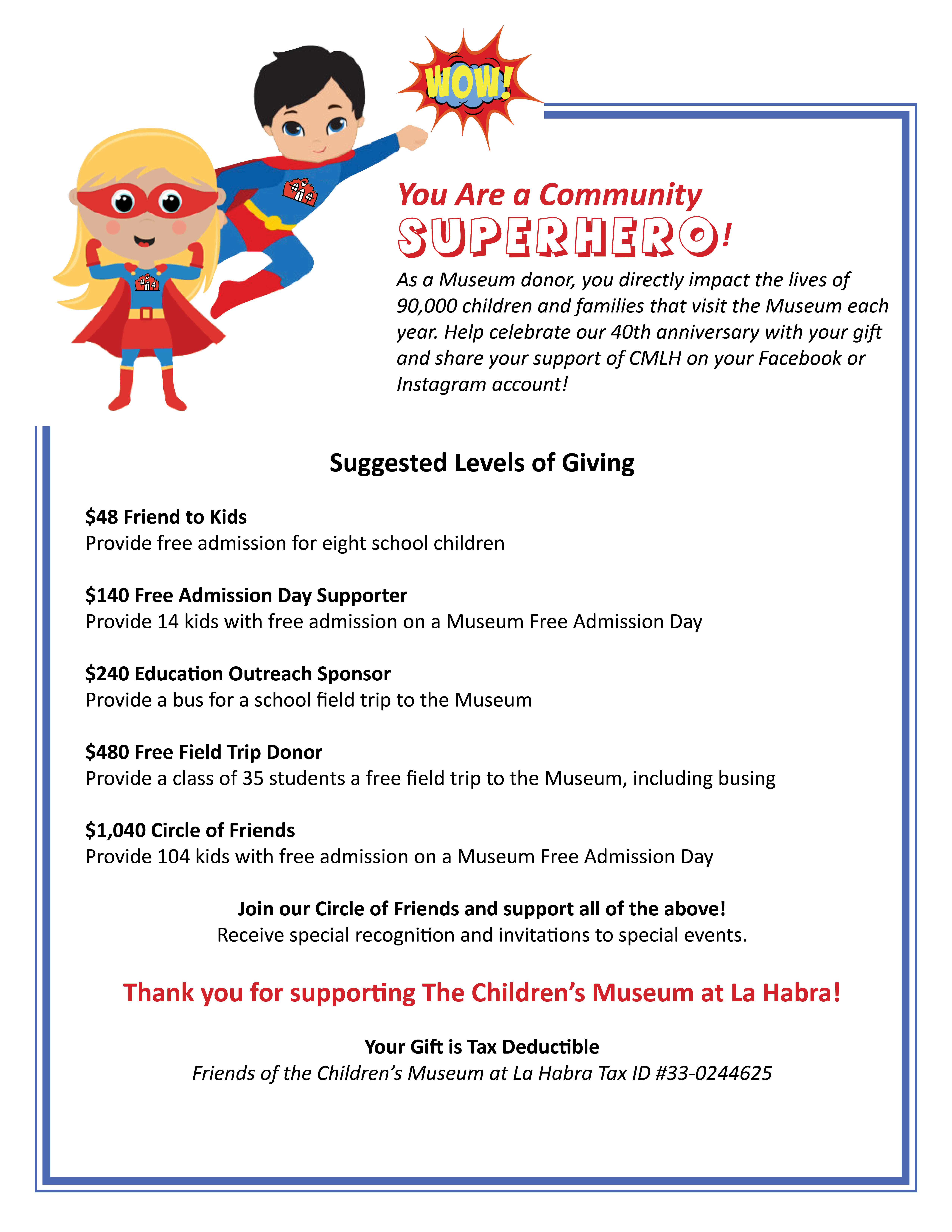 To donate by check, download a donation form (PDF) and mail with your check payable to: Friends of the Children's Museum at La Habra